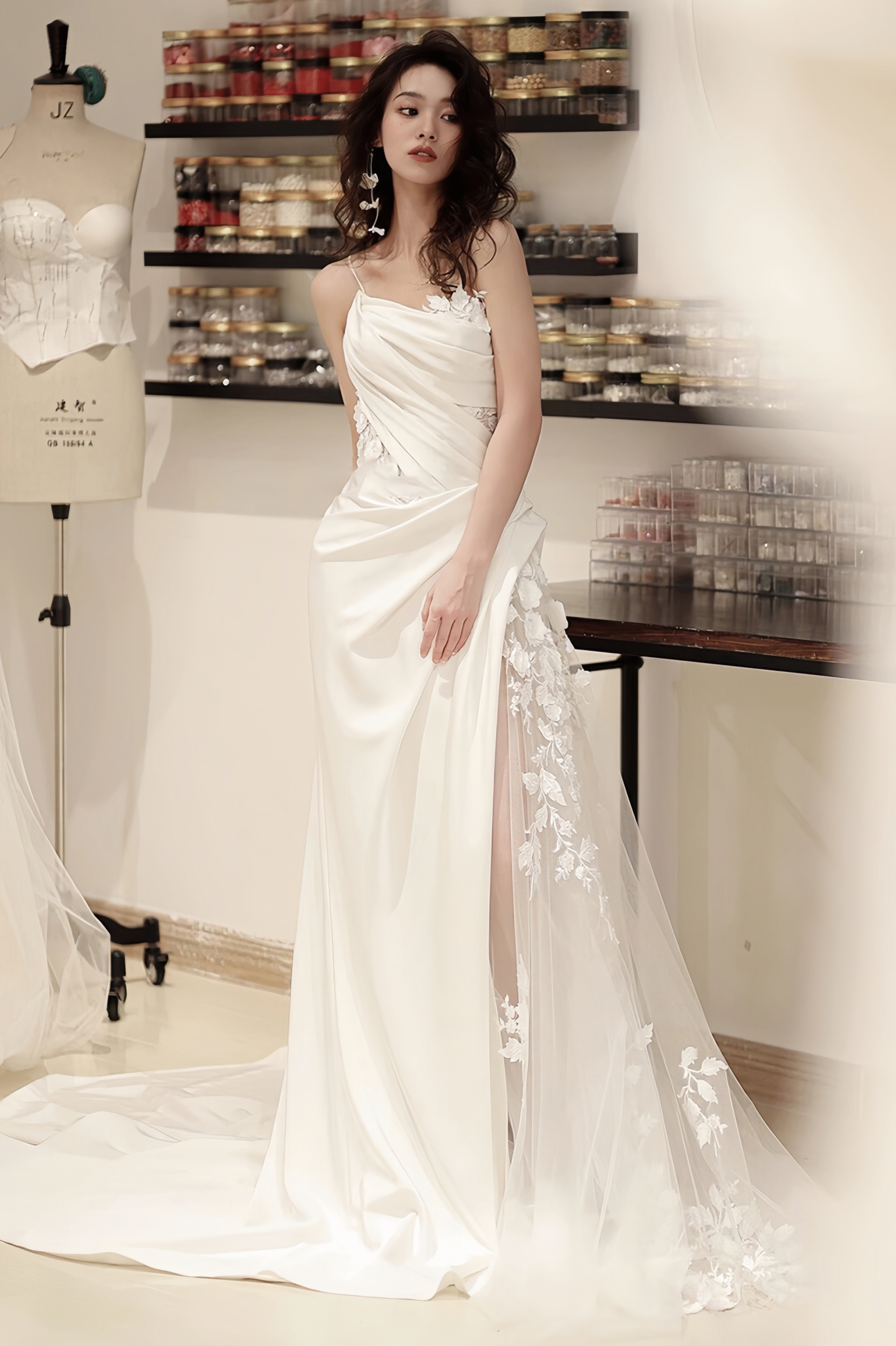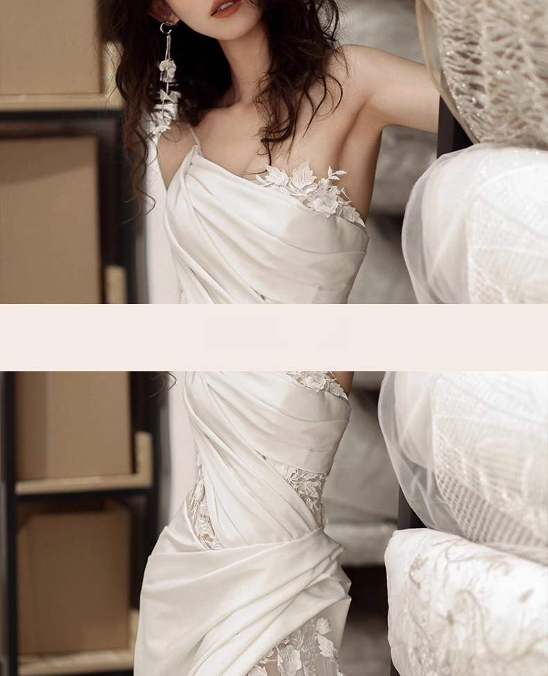 This off-white mermaid wedding gown, with its unparalleled exquisite craftsmanship and romantic design, perfectly embodies the ultimate aesthetic of a luxurious wedding dress. One shoulder strap cleverly drops, creating an elegant asymmetrical off-the-shoulder structure. The shoulders are adorned with fluffy, cloud-like petal-shaped sleeves, covered in delicate lace patterns, creating a gentle mist that envelopes the bride.