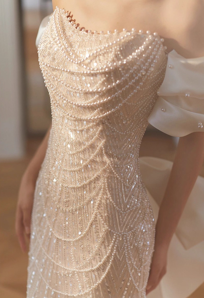 The entire process is hand-sewn, and the bead inlay alone takes more than 12 hours. The bust and waist circumference can be customized free of charge, and it fits you perfectly when you put it on.