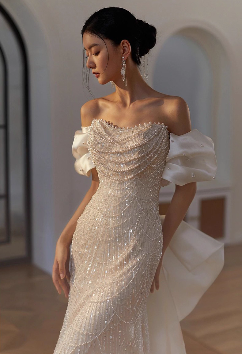 It uses fine shimmering lace specially used for high-end customization and is paired with hand-beaded pearl chains. It has a dreamy luster under the sun and looks like a walking work of art from every angle.