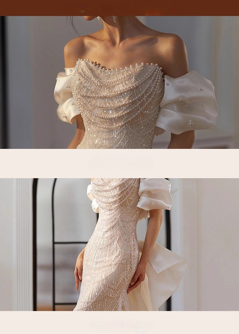 This off-white mermaid wedding dress perfectly interprets the balance between light luxury and exquisiteness. One side of the shoulder strap cleverly drops down to form an asymmetrical romantic one-shoulder design. The shoulder is embellished with fluffy petal-shaped sleeves and embellished with delicate lace patterns.