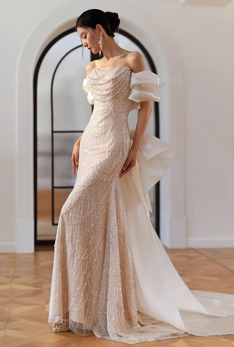 The entire process is hand-sewn, and the bead inlay alone takes more than 12 hours. The bust and waist circumference can be customized free of charge, and it fits you perfectly when you put it on.