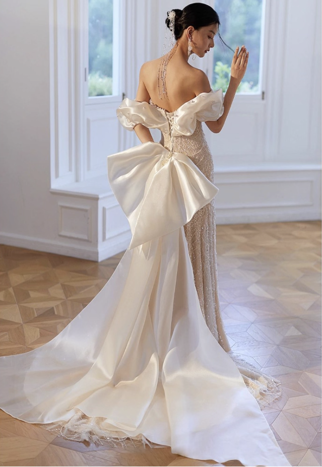 This off-white mermaid wedding dress perfectly interprets the balance between light luxury and exquisiteness. One side of the shoulder strap cleverly drops down to form an asymmetrical romantic one-shoulder design. The shoulder is embellished with fluffy petal-shaped sleeves and embellished with delicate lace patterns.