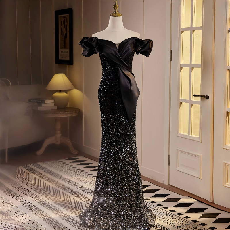 The off-the-shoulder design cleverly reveals the collarbone, while the slightly sheer mesh panels create a sexy, sophisticated yet elegant look. The custom teardrop-shaped cutout detail at the back waist creates a captivating allure with every turn.