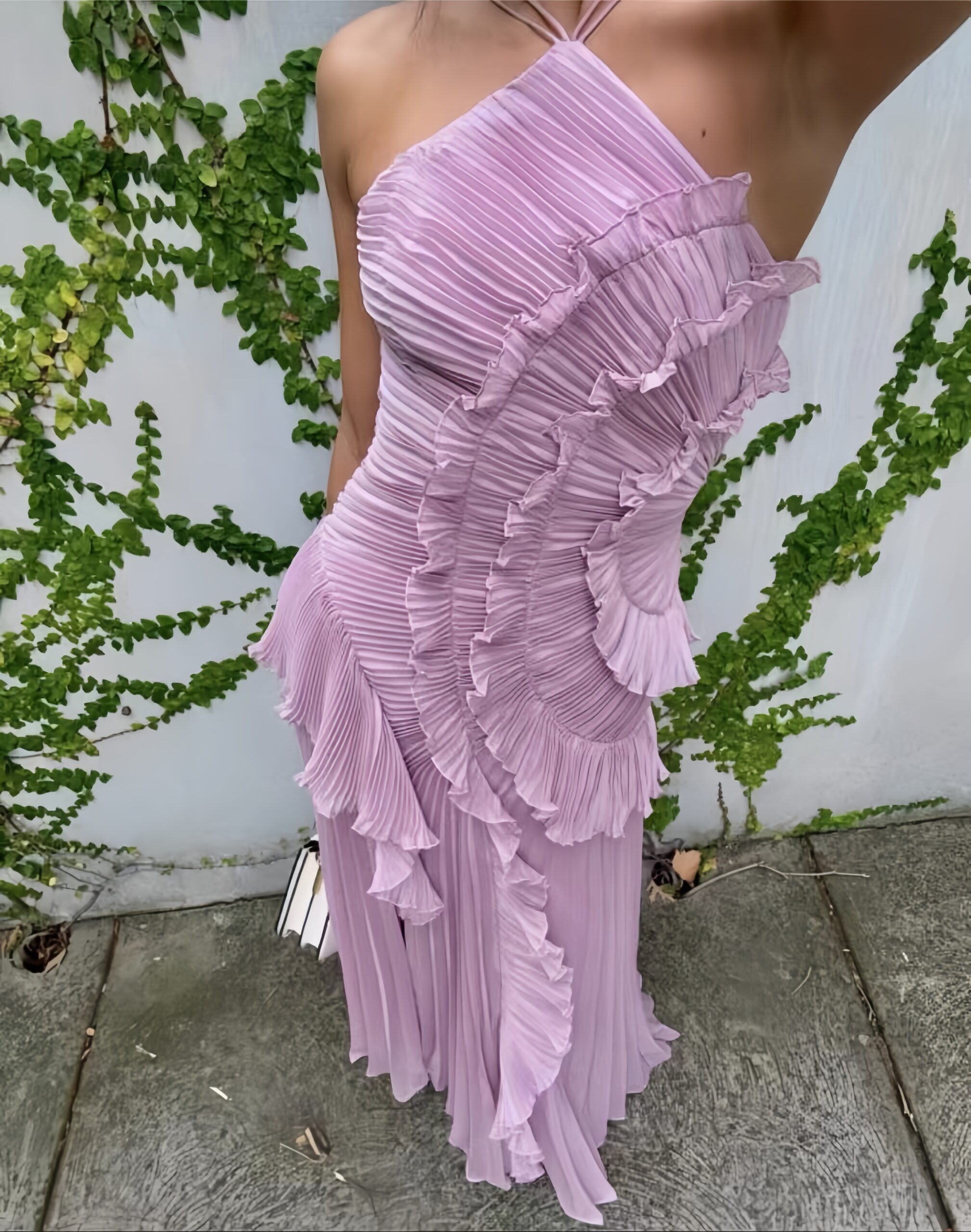 A soft pink-purple hue creates a romantic silhouette, as if transforming a lavender field at dusk into a gentle cloud. The chiffon fabric is as light and breathable as a cloud, delicate as silk, and its drape evokes a sense of fluidity. The sharp cut at the shoulders reveals the clavicle, while the sculpted pleats at the chest ripple like cascading lines. The ruffled waistband sways with the figure, and the open back exudes a sensual and relaxed air, evoking a sense of effortless elegance.