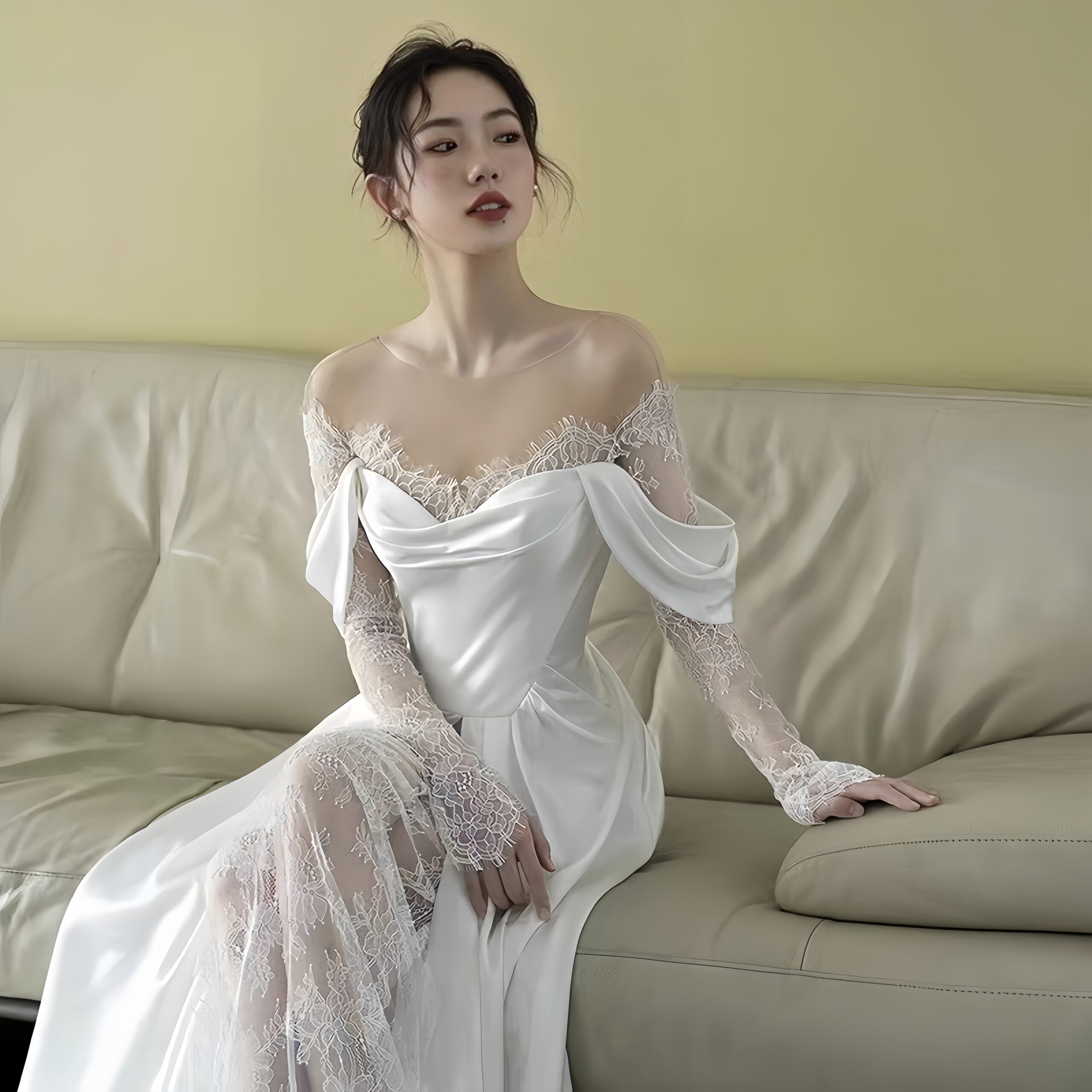 This wedding dress is designed for plus-size brides, outlining the confident curves with French romance, letting the lace speak tenderly and letting the white gauze carry dreams