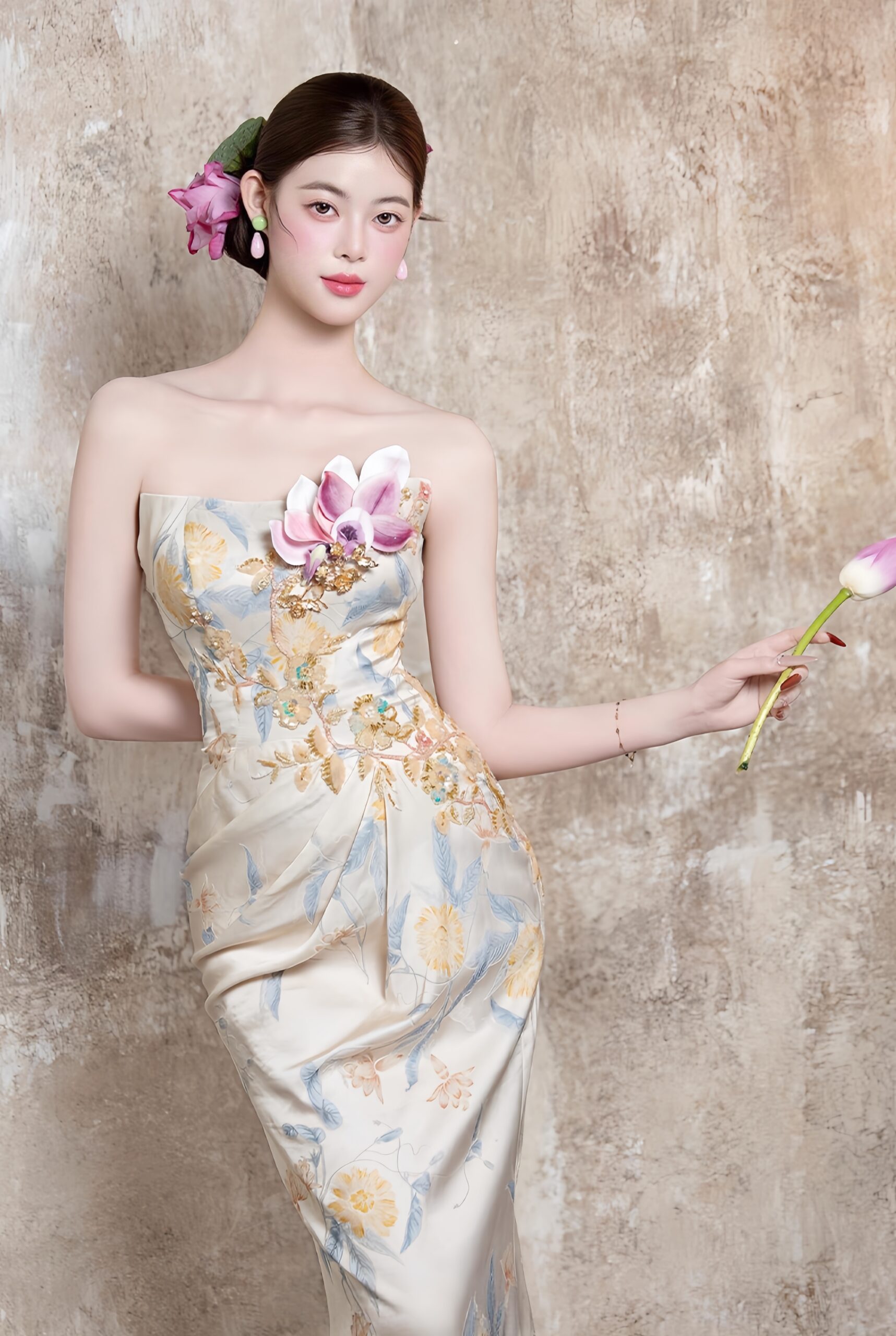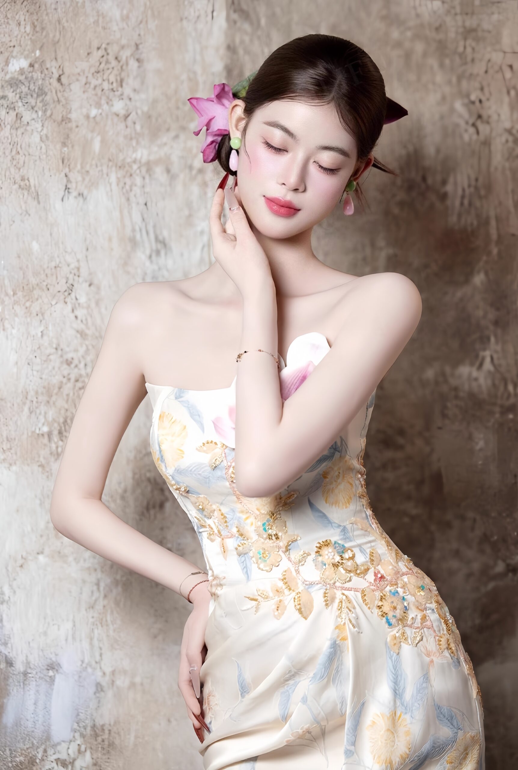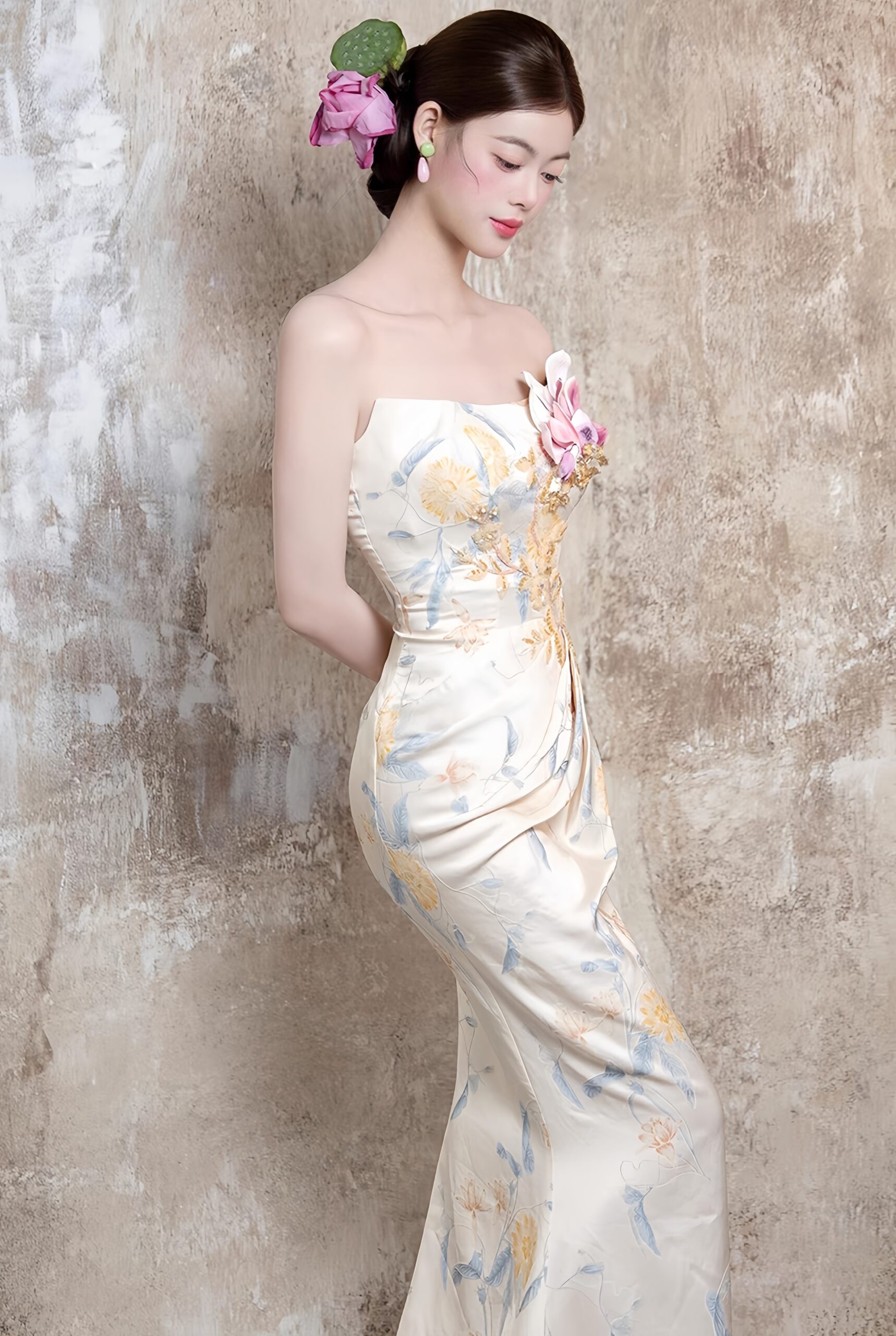 This dress is simple and elegant, integrating the elements of Chinese flowers – lotus