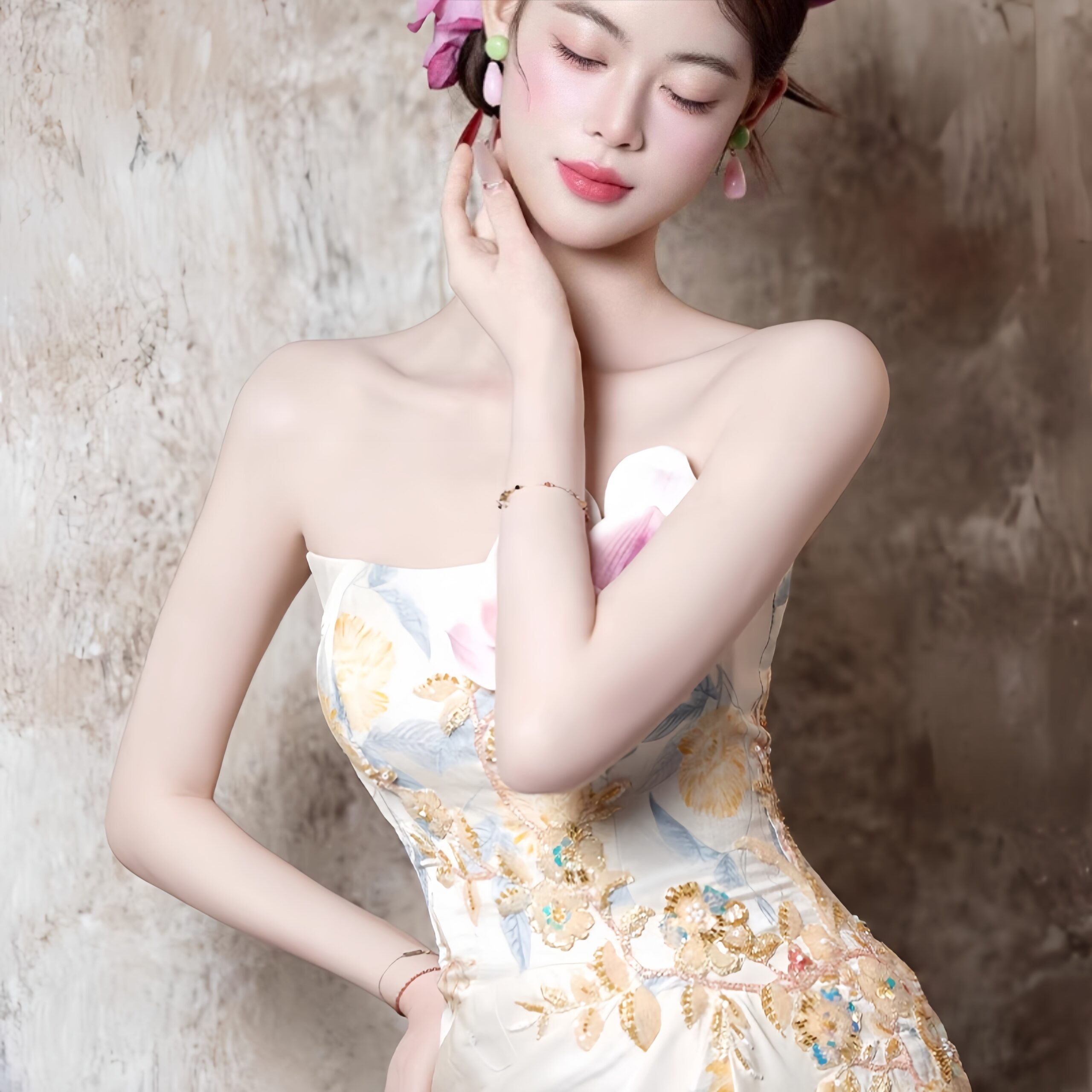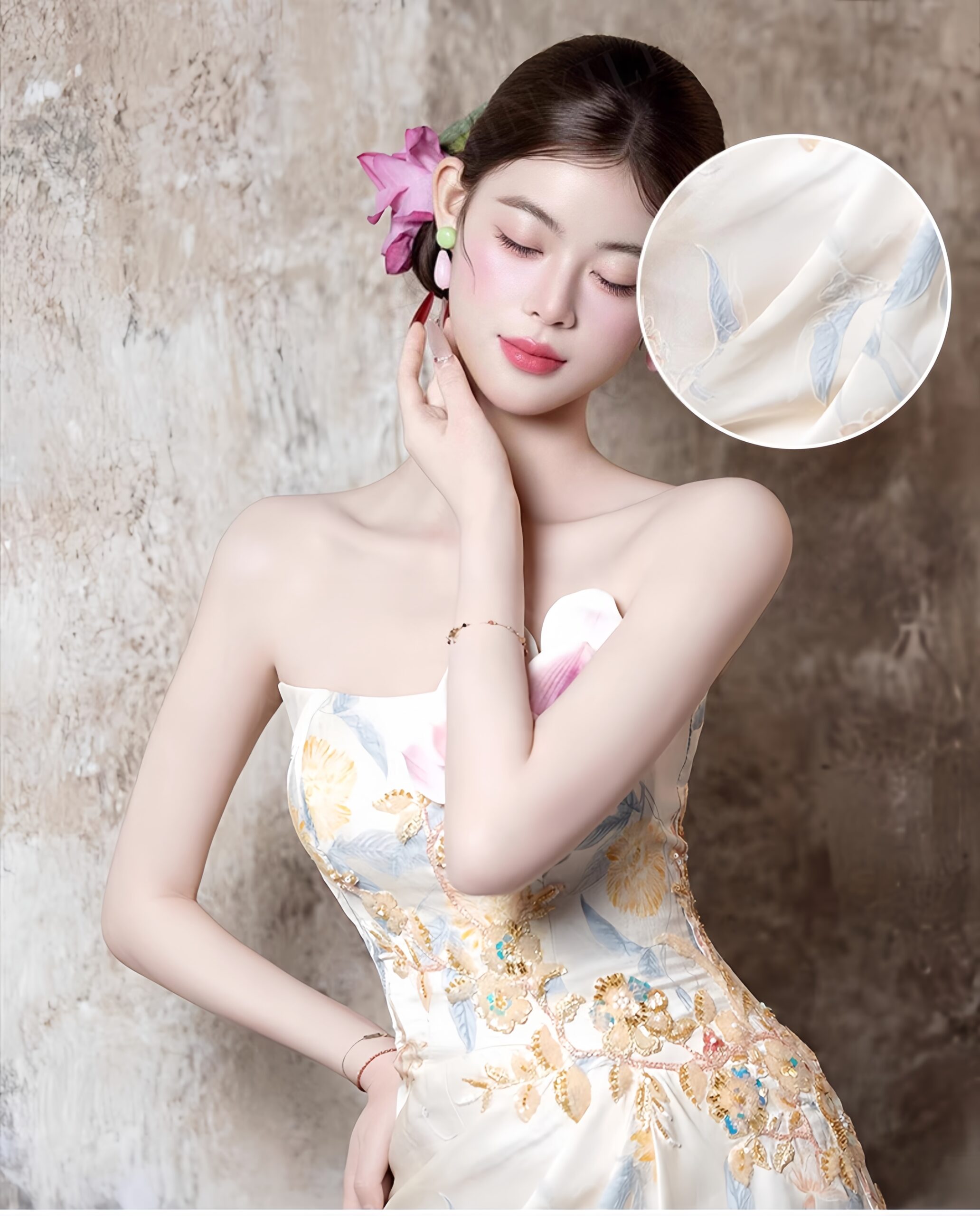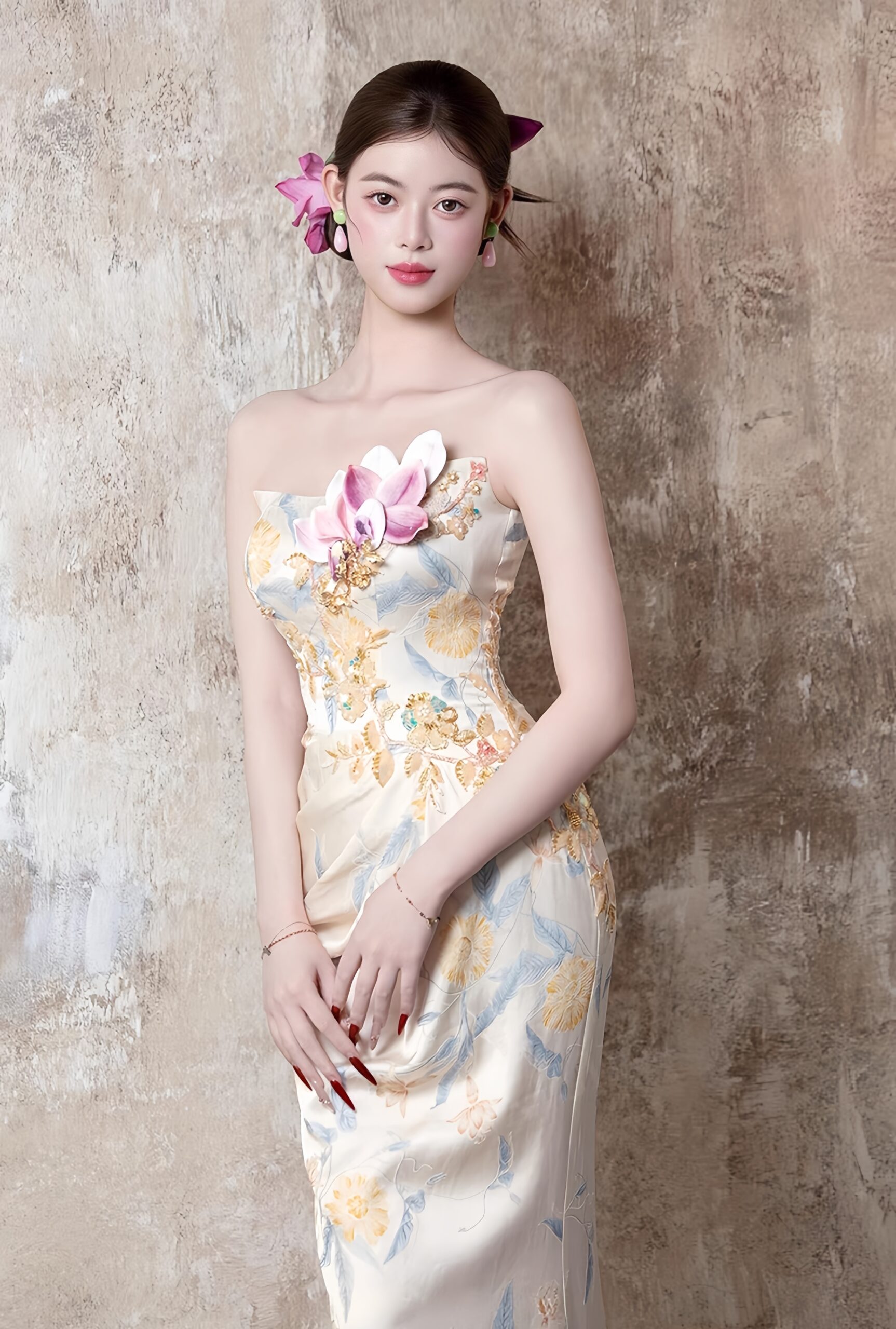 This dress is simple and elegant, integrating the elements of Chinese flowers – lotus